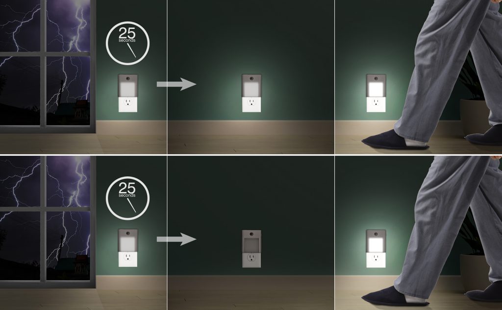 1 Veilleuse à atténuation automatique - La LED s'atténue lorsqu'aucun mouvement n'est détecté pendant 25 secondes et s'éclaircit lorsqu'un mouvement est détecté dans des conditions de faible luminosité.